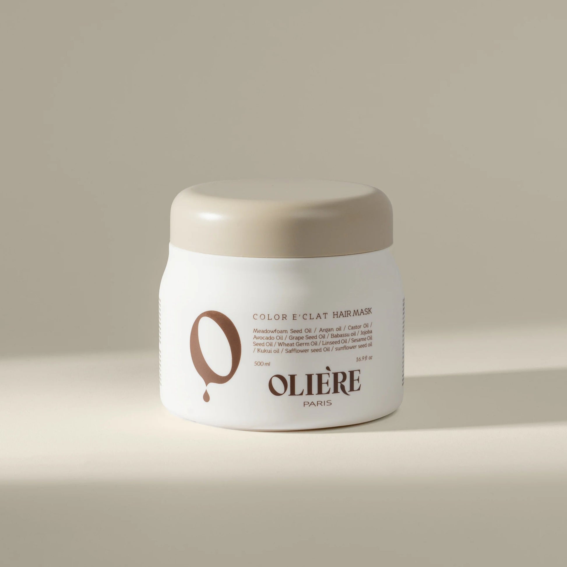 En nærende hårmaske udviklet af OLIERE PARIS laboratorier, specielt designet til hår, der har gennemgået kemiske behandlinger, med fokus på farvning eller lysning.